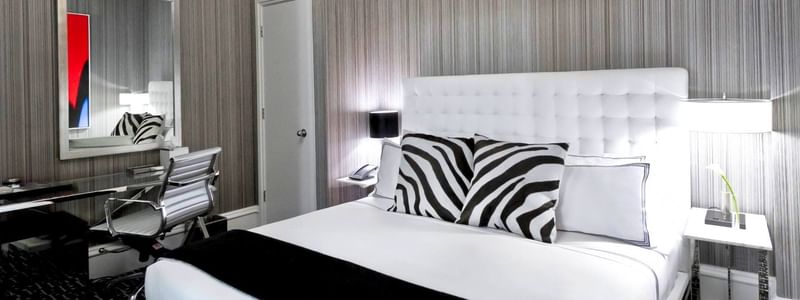 The highlight of The Moderne, our spacious Studio Suites with 1 King Bed feature sleek mid-century modern design and open loft-style layouts. Enjoy a luxurious King-sized bed, plus a living area with a large flat-screen Smart TV. Starting at 400 square feet, select suites also include private outdoor terraces overlooking Midtown Manhattan.